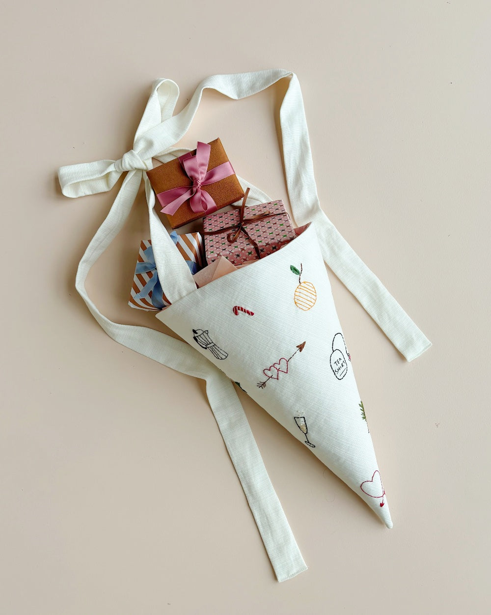 Til Walthers Vintage syede jeg et oversized kræmmerhus med sløjfehank. Kræmmerhuset pyntede jeg med små håndbroderede julemotiver. Langsommeligt håndarbejde, der hylder Lisbeths forretningskoncept og kan pynte blandt hendes mange upcyclede værker.